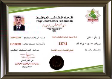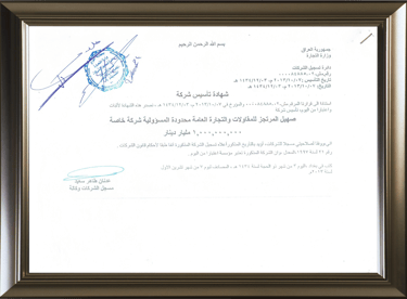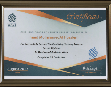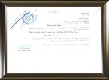شهادة إدارة أعمال للشركة صادرة من (مركز البحوث والدراسات التابع للأمانة العامة لمجلس الوحدة الاقتصادية العربية والهيئة الدولية للتحكيم).