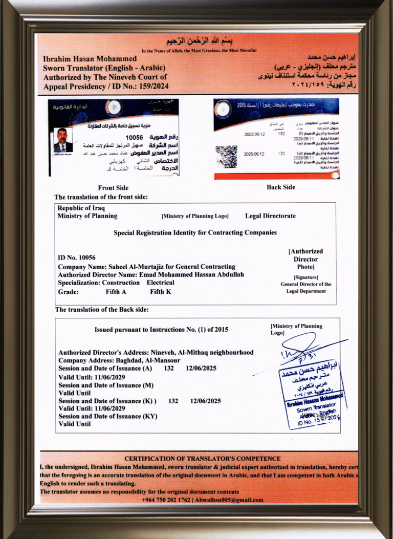 Este documento es la Identidad de Registro oficial de la Empresa Saheel Al-Murtajez , emitida por el Ministerio de Planificación / Dirección Legal en la República de Iraq. La identidad está registrada bajo el número 10056 y pertenece al Director Autorizado Emad Mohammed Hassan Abdullah. La empresa se especializa en obras de Construcción y Electricidad, contando con una clasificación de Quinto grado. Emitida conforme a las Instrucciones n.º (1) de 2015 el 12 de junio de 2025, esta identidad es válida hasta el 11 de junio de 2029, lo que confirma la elegibilidad legal de la empresa para ejecutar proyectos dentro de sus campos designados.